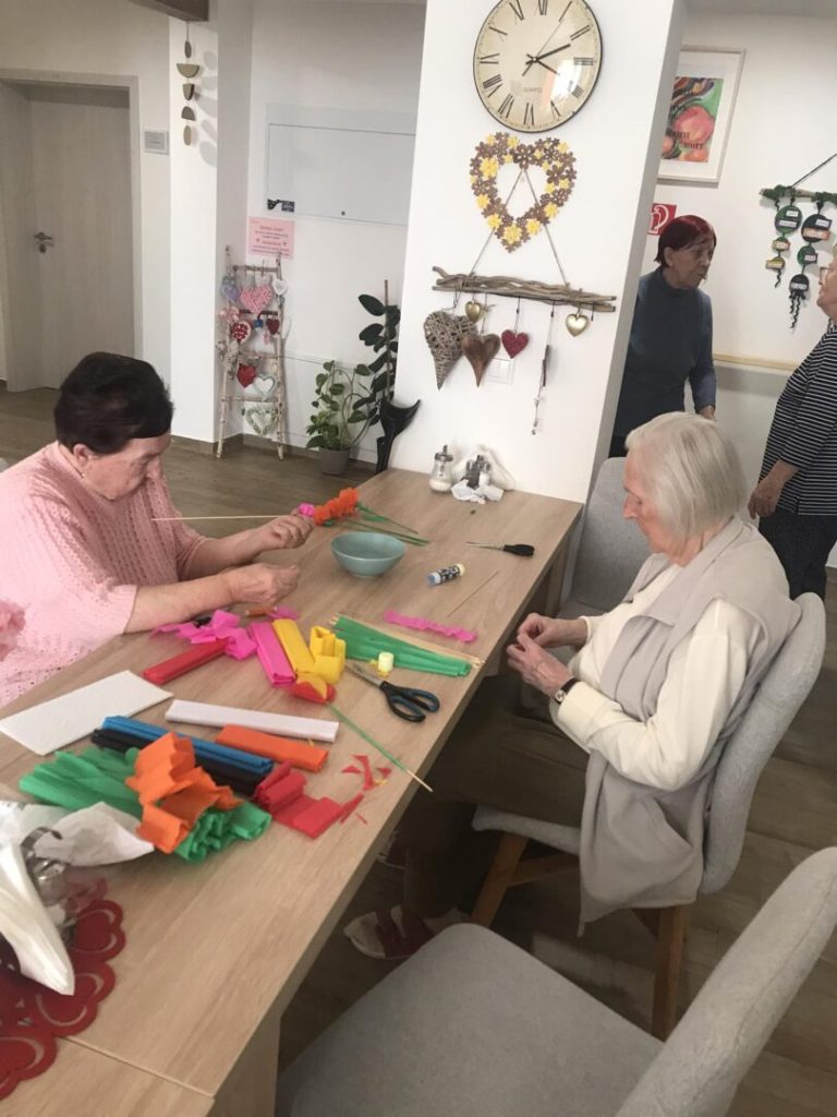 Naše šikovné klientky si v rámci tvorivého popoludnia vytvorili krásne kvety z krepového papiera. Svoju kreativitu pretavili do krásnych kvetinových výtvorov a zároveň si posilnili aj jemnú motoriku, ktorá predstavuje dôležité pohybové schopnosti a zručnosti týkajúce sa koordinácie pohybov ruky od ramena k prstom, mikromotoriky očných pohybov, artikulačných orgánov či grafomotoriky.