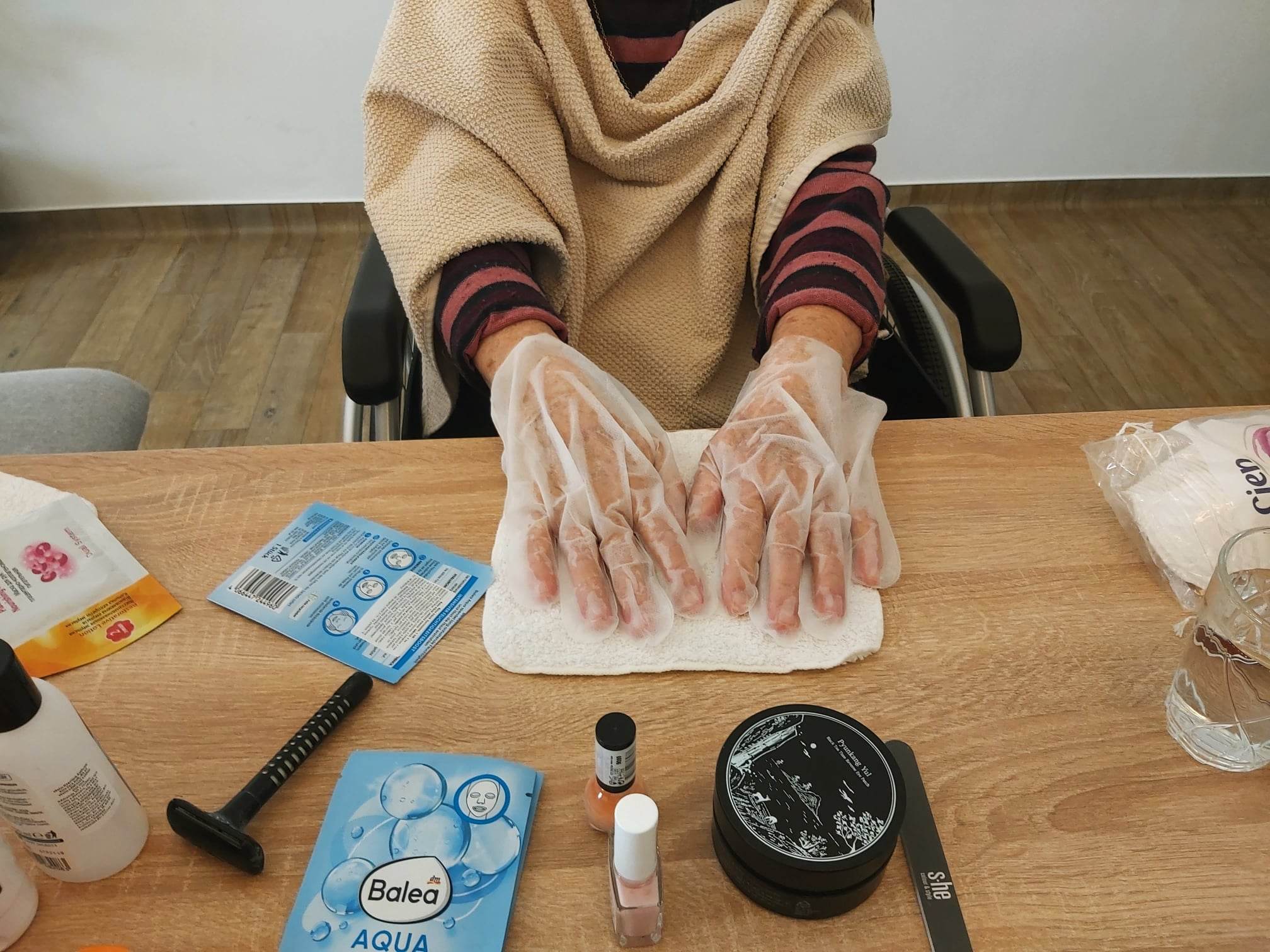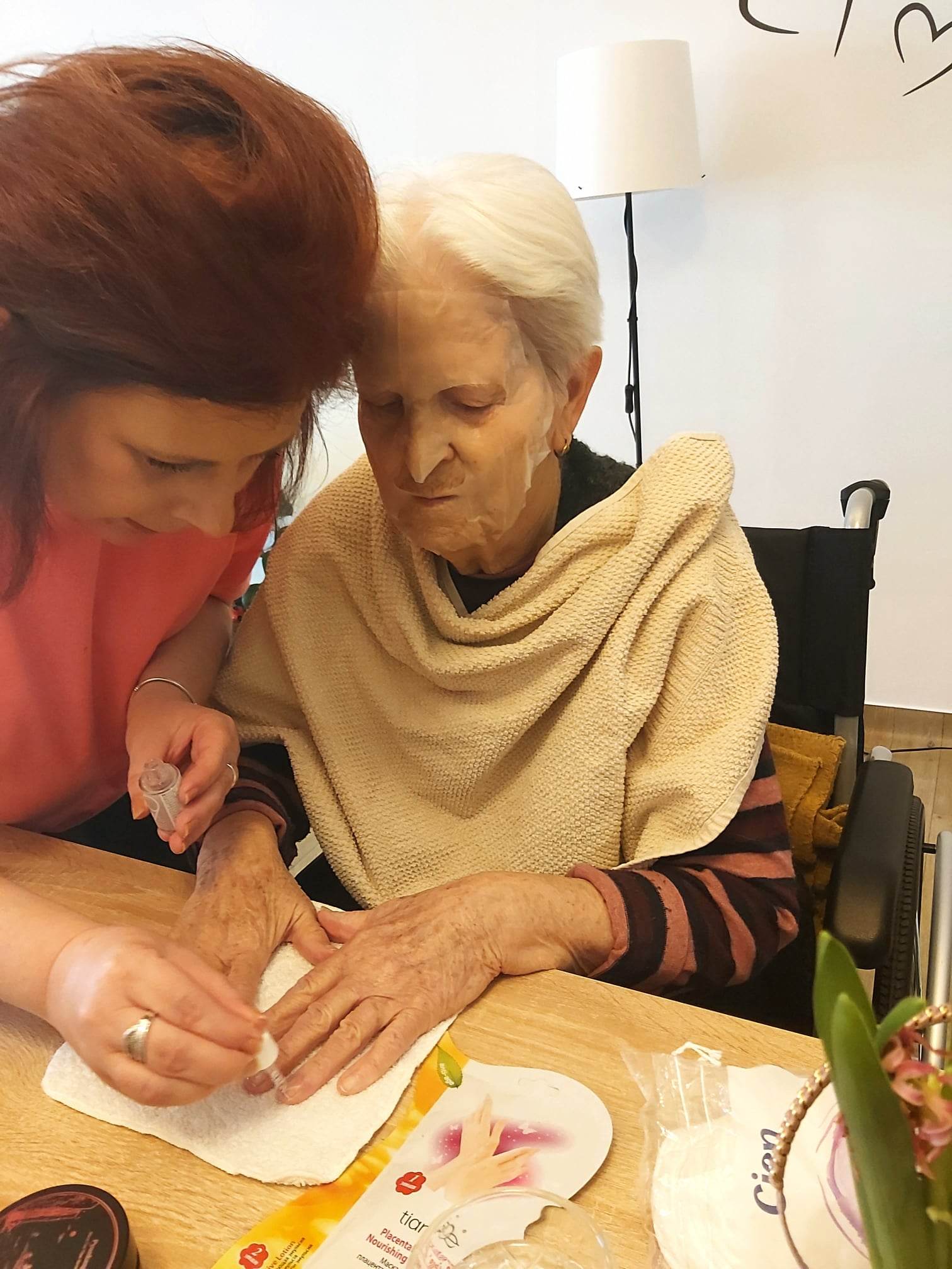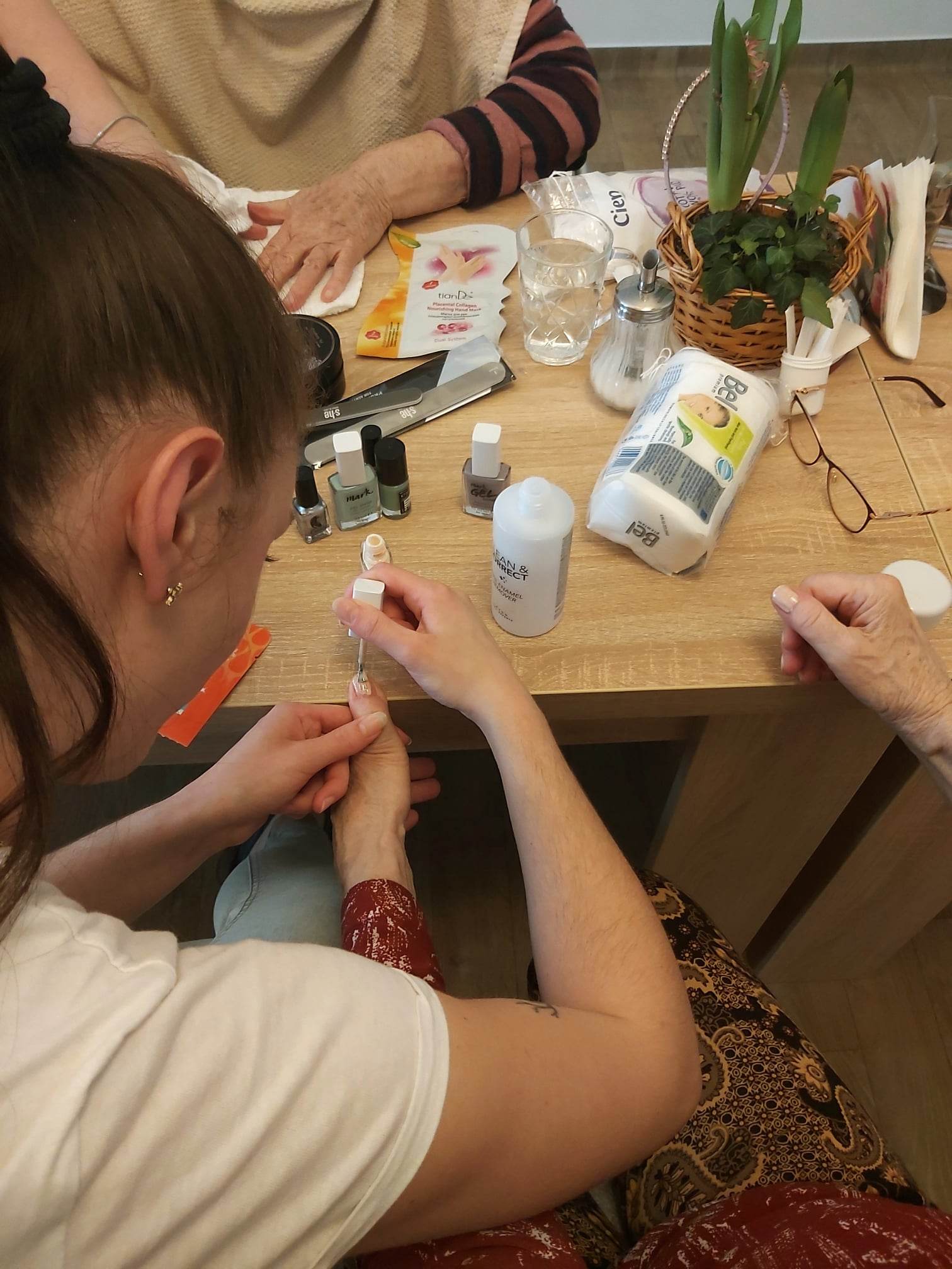 Dnešné popoludnie sa nieslo v znamení skrášľovania našich klientiek prostredníctvom kozmetických prípravkov. Naše kolegyne Viki a Beátka aplikovali masky na tvár a ruky, nasledovali masáže tváre a rúk, rôzne peelingy a lakovanie nechtov. Naše klientky si počas ošetrovania pleti oddýchli a boli veľmi spokojné. Už teraz sa tešia na ďalšie takéto popoludnie.
